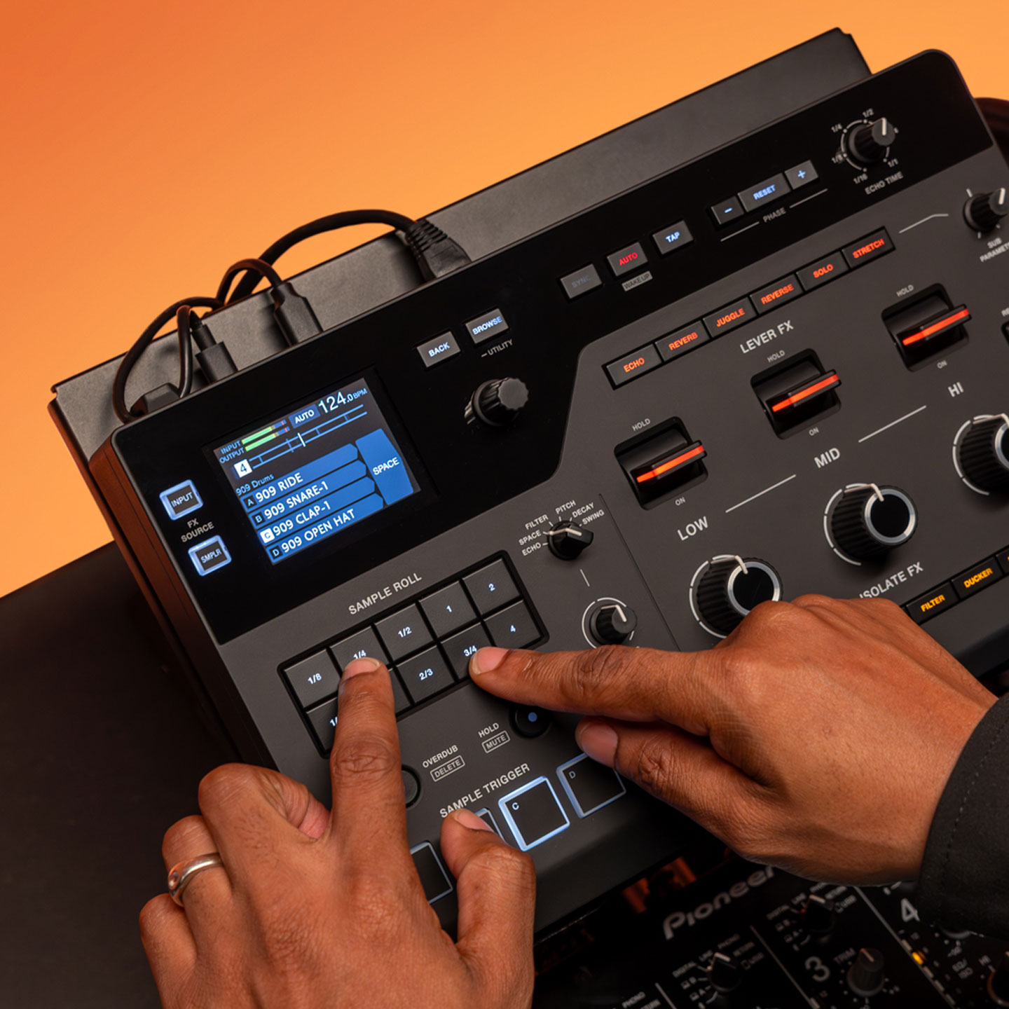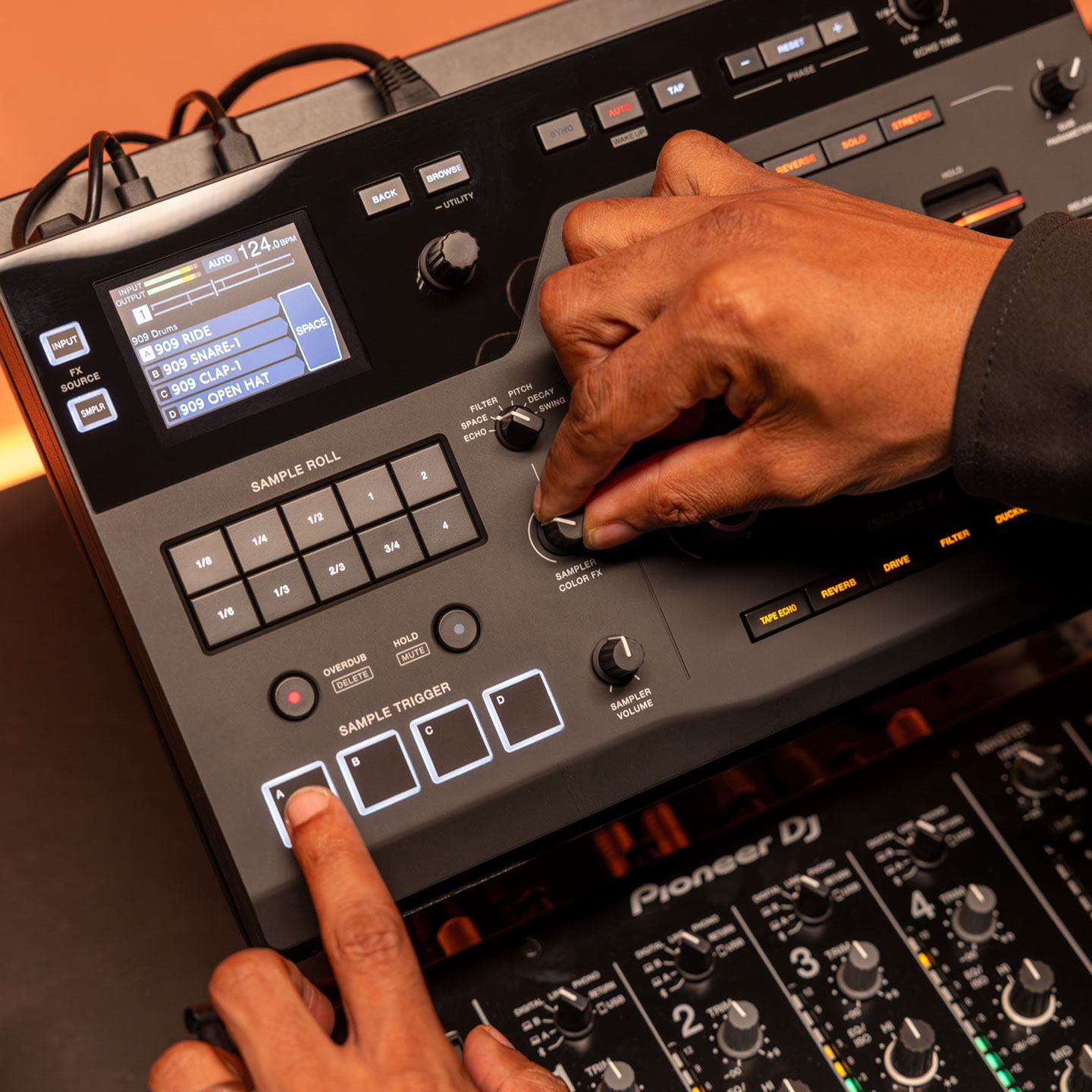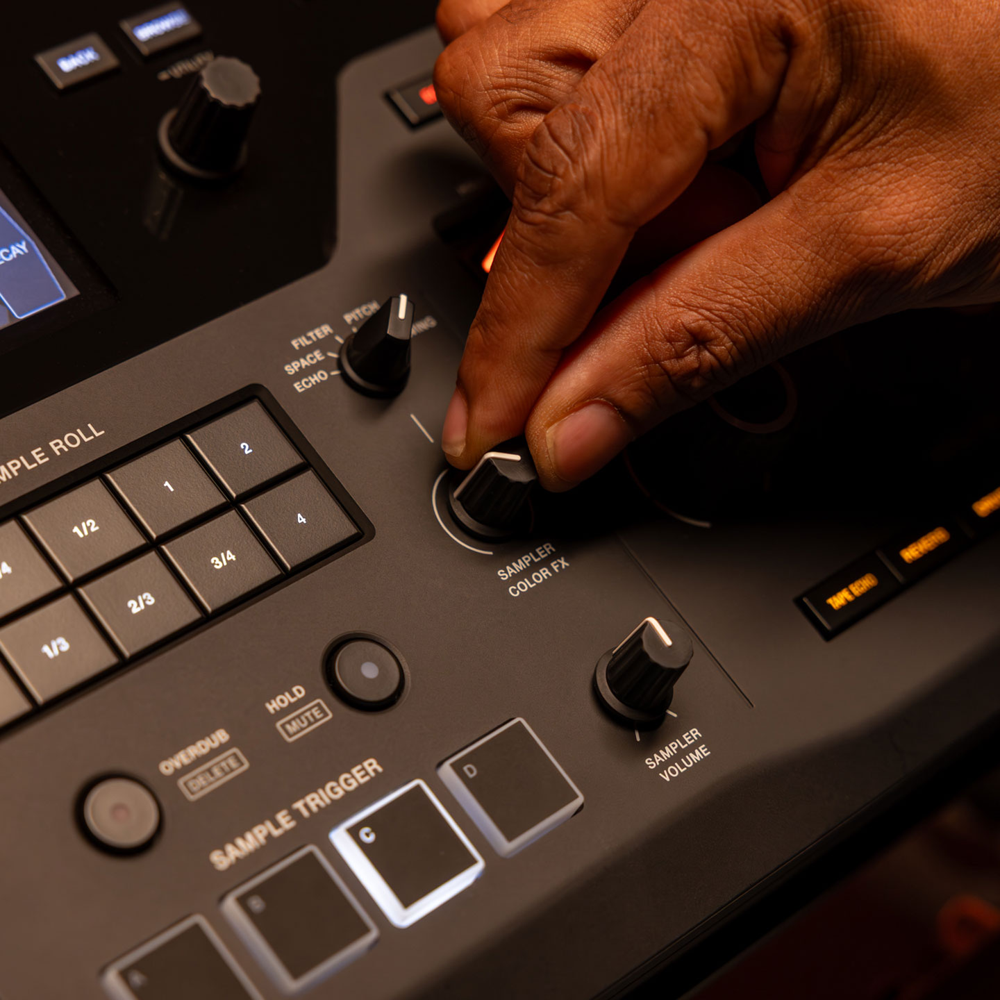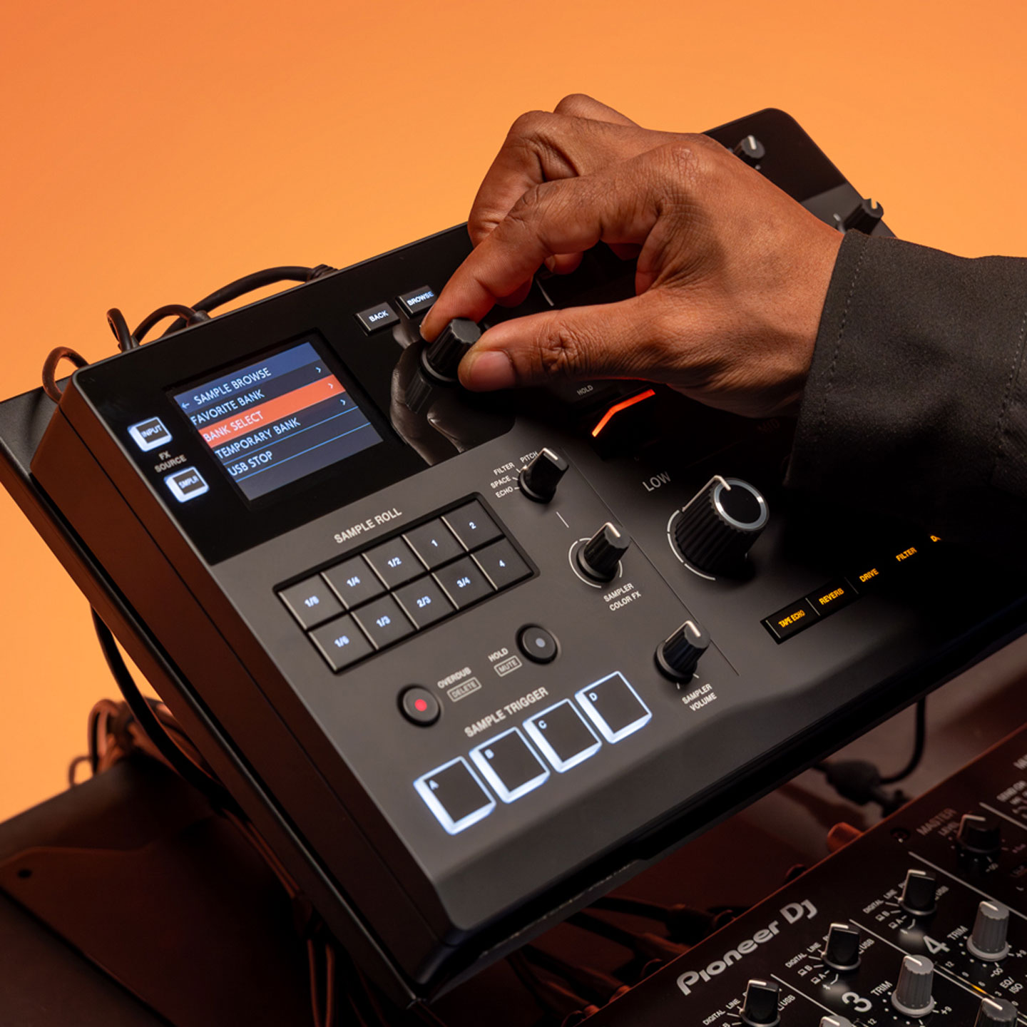 The multicolor display lets you check key details such as 3-Band FX sub-parameters, loaded samples, selected Sampler Color FX, BPM, and input/output levels. You can also browse and quickly select samples directly from the screen, enabling confident operation and full focus on your performance.