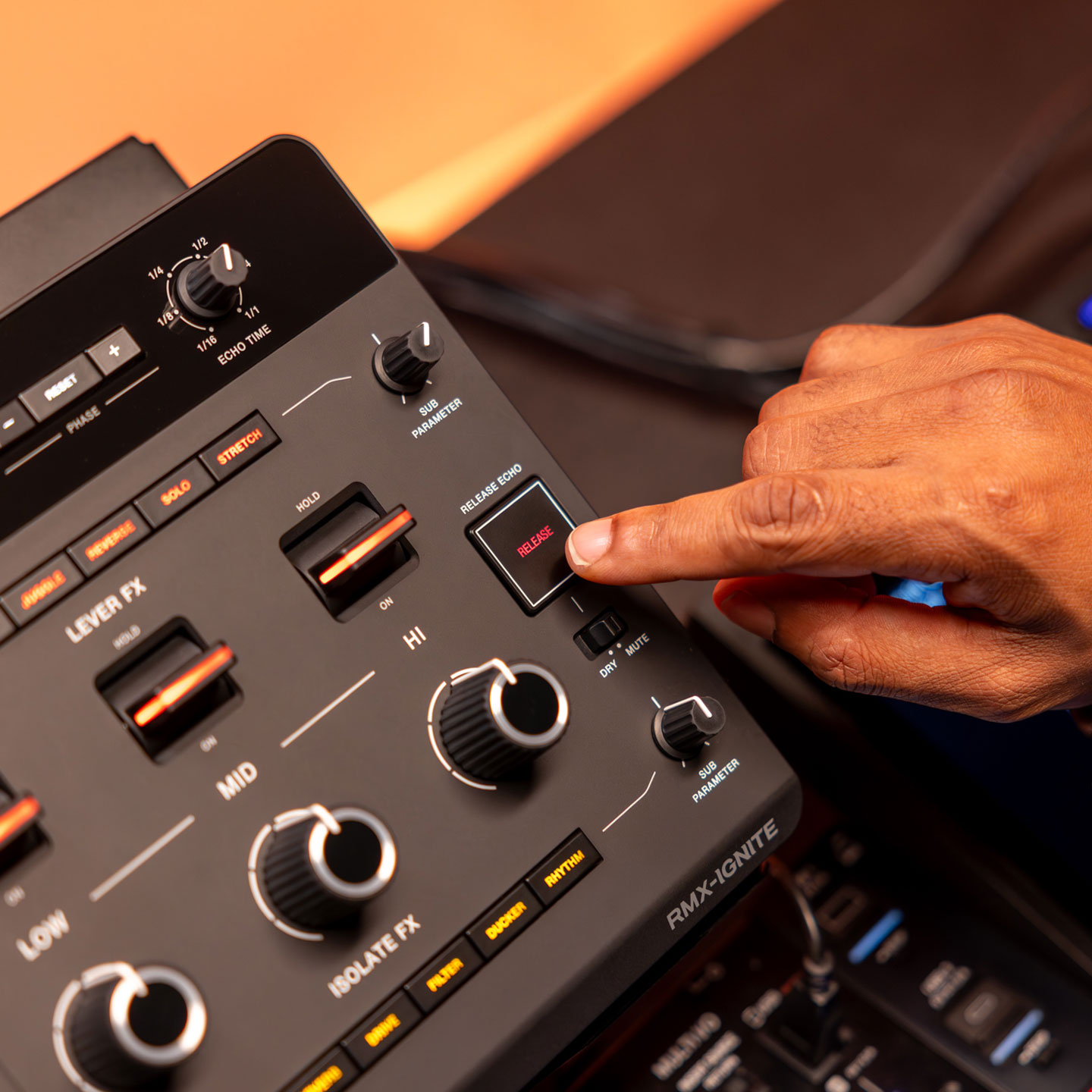 The name RMX-IGNITE represents sparking creativity and opening new possibilities for DJs to express themselves. Add this effector to your setup and you can show your individuality in live performances that are unmistakably yours, fusing expressive sound control with energetic movements.